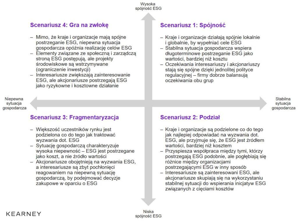 Eksperci podkreślają, że przyszłość ESG w obecnej formule jest niejasna. Niewiadomą pozostaje zwłaszcza poziom międzynarodowej i krajowej spójności w kwestiach z nią związanych. W raporcie przedstawione są cztery prawdopodobne scenariusze, co w zakresie zrównoważonego rozwoju może wydarzyć się w biznesie do końca dekady. Scenariusz pierwszy byłby najbardziej pożądany. Pozwoliłby na spójne i szybkie wdrażanie celów ESG do organizacji przy jednoczesnym wsparciu interesariuszy i akcjonariuszy. Pozostałe scenariusze zakładają mniej optymistyczny rozwój – albo w kontekście sytuacji gospodarczej, albo globalnej spójności postrzegania ESG i ujednolicania środowiska regulacyjnego.