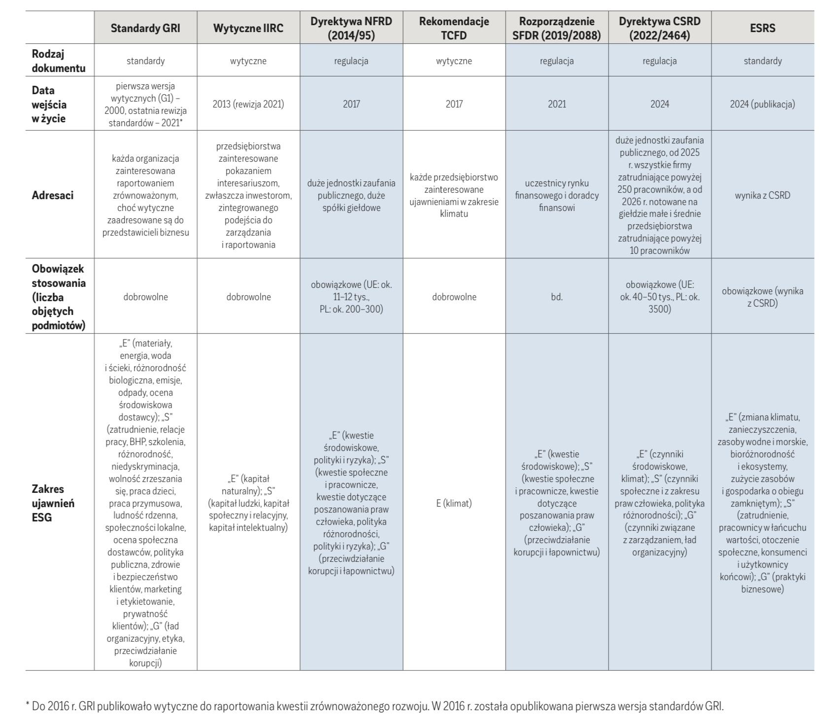 Syntetyczne porównanie kluczowych wytycznych i regulacji dotyczących ujawnień ESG znajduje się w tabeli.
