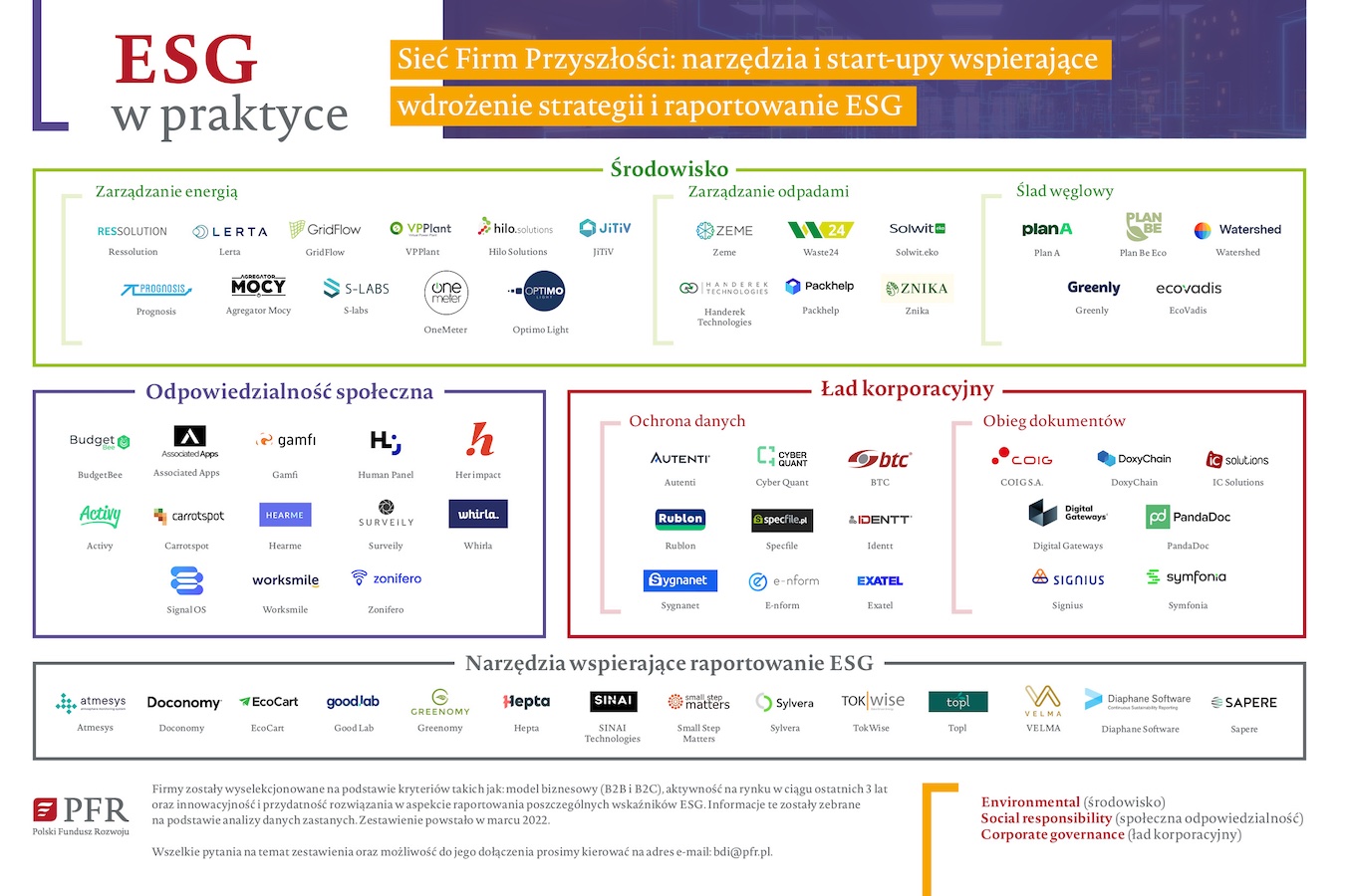 PFR przygotował specjalne zestawienie start-upów i narzędzi wspierających raportowanie ESG. Ma ono na celu ułatwienie dostosowania się firm do nowych standardów. Firmy technologiczne zostały podzielone, zgodnie z kluczowymi obszarami raportowania, na czynniki środowiskowe, społeczną odpowiedzialność, ład korporacyjny. Dodatkiem do mapy jest zestaw praktycznych narzędzi ułatwiających raportowanie.