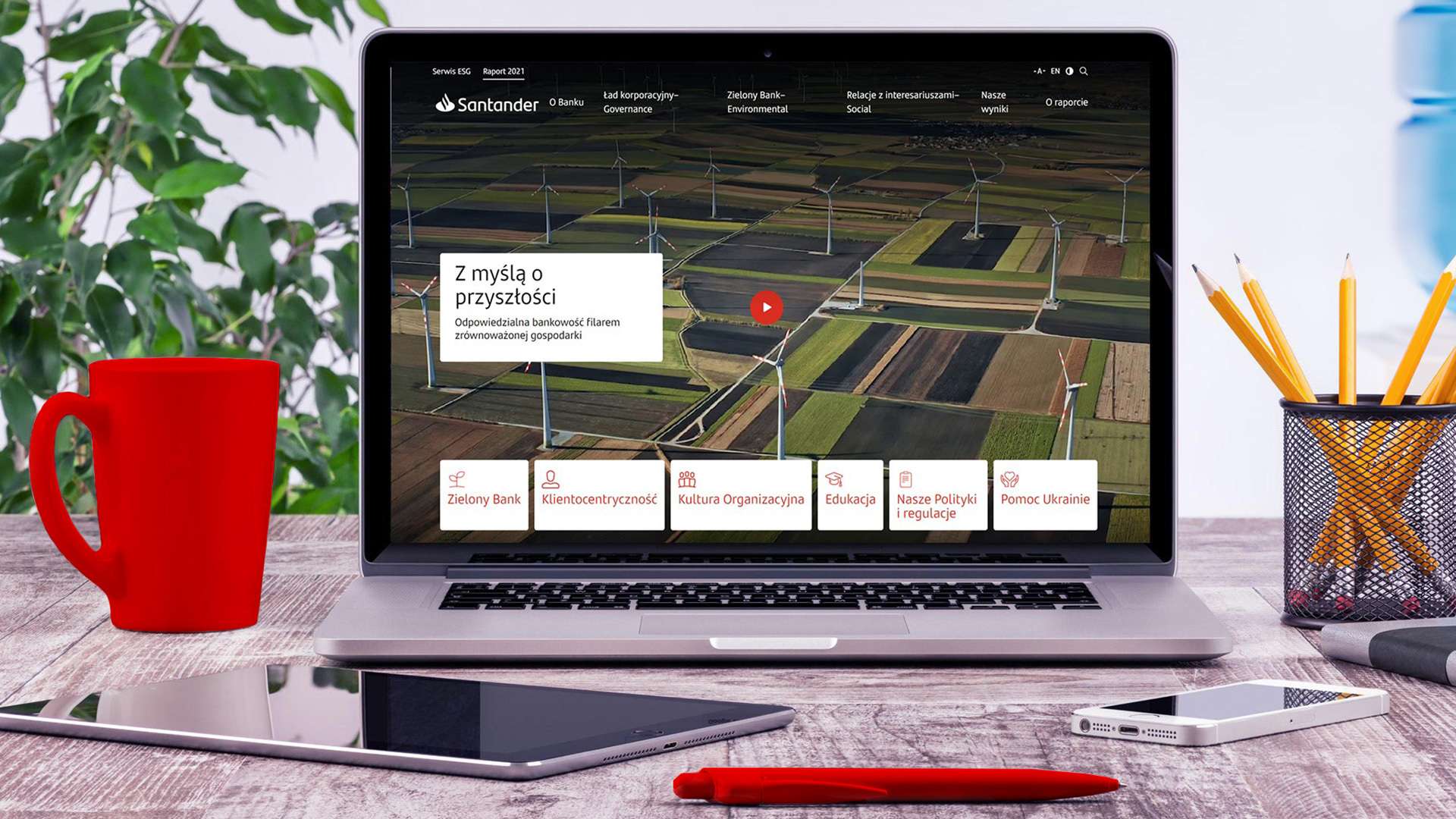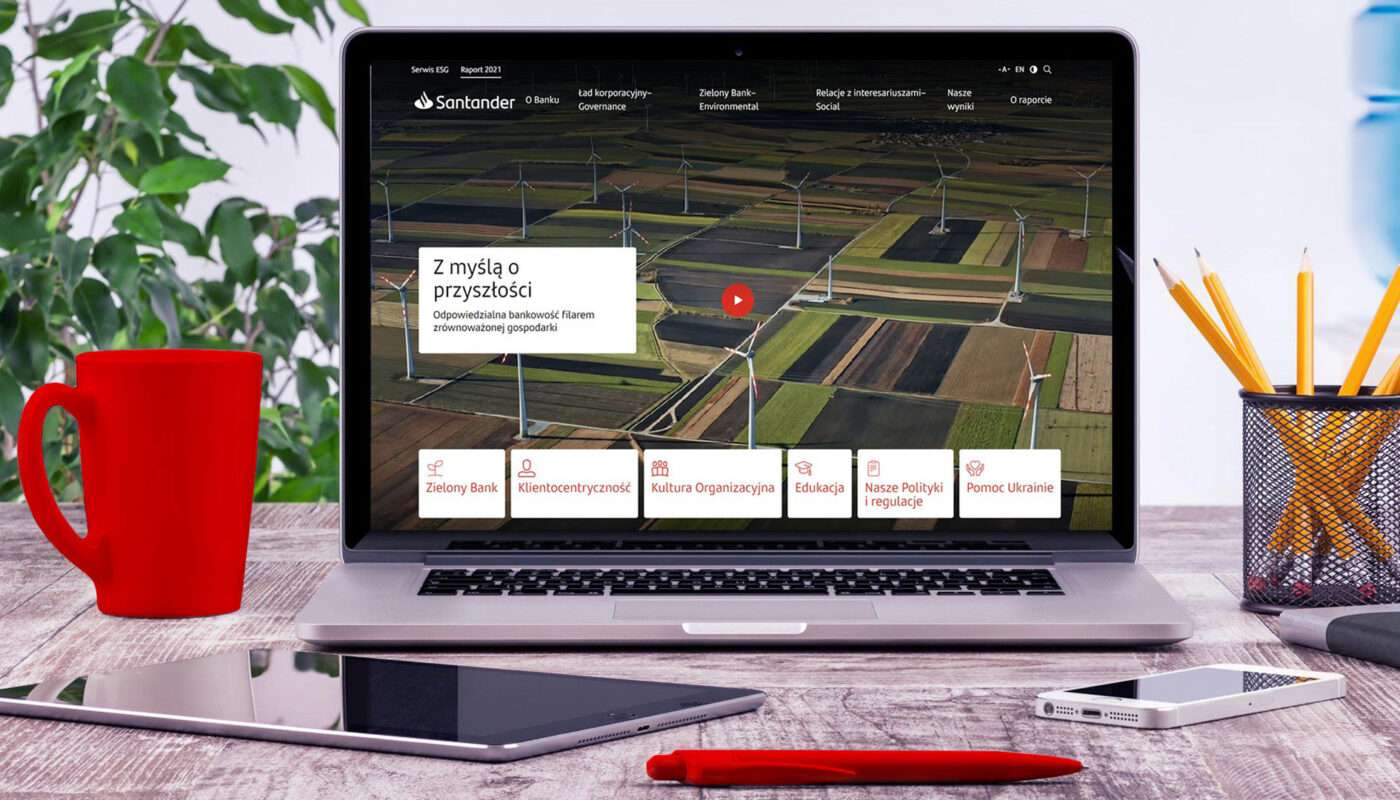 Raport ESG 2021 opublikowany przez Santander Bank Polska to już dziewiąta edycja dokumentu, który przedstawia wpływ organizacji na obszary zarządcze, społeczne i środowiskowe. Tegoroczną nowością jest raport klimatyczny, opracowany według kryteriów TCFD, jako integralny element części środowiskowej. Zawarta w nim analiza ryzyk i szans klimatycznych to kolejny krok w świadomych przygotowaniach banku na wyzwania najbliższej przyszłości.