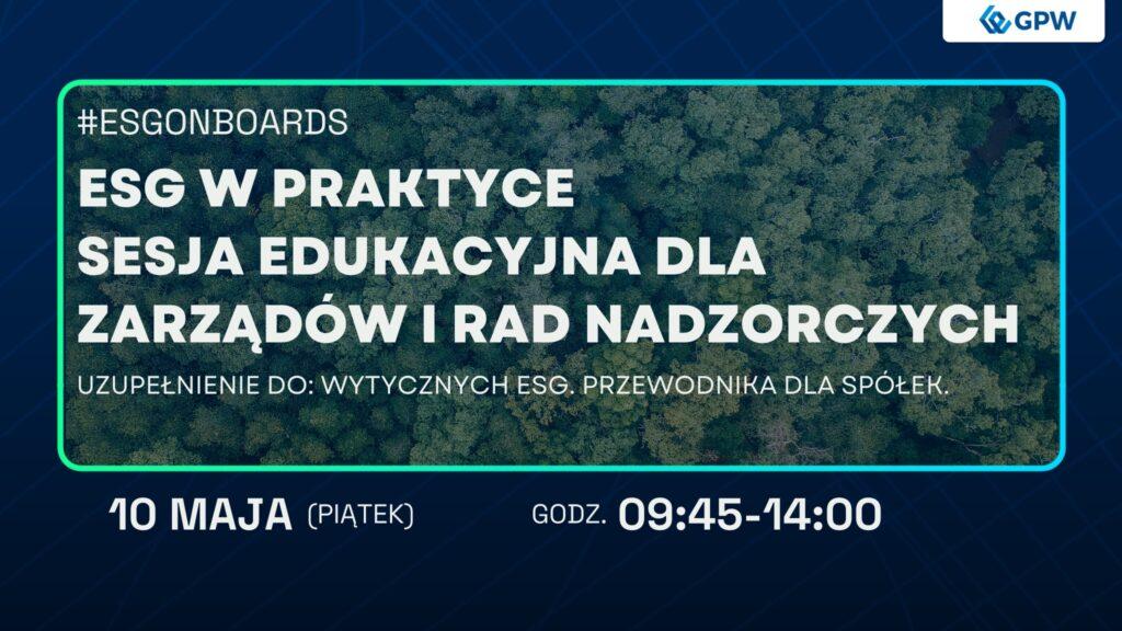 Giełda Papierów Wartościowych w Warszawie organizuje #ESGONBOARDS – Sesję edukacyjną dla Zarządów i Rad Nadzorczych dotyczącą wybranych aspektów związanych ze zrównoważonym rozwojem i raportowaniem ESG. Bezpłatne szkolenie odbędzie się 10 maja w godz. 9:45-14:00 w formule on-line.